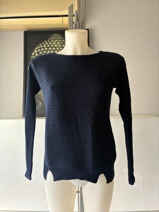Jersey de punto fino con un diseño de rayas horizontales en relieve de color azul marino. De la marca Síntesis. Talla S Diseño de rayas horizontales. Cuello redondo. Mangas largas. Bajo con aberturas laterales. Composición: 50% lana 50% acrílico Como nuevo. PARA ENVIAR O PARA ENTREGAR EN BARCELONA