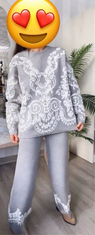 Conjunto de punto formado por jersey y pantalón.Disponible en negro y gris . - Jersey con estampado. - Pantalón de pierna ancha con cordón. - Detalle de bordado en los bajos del pantalón.