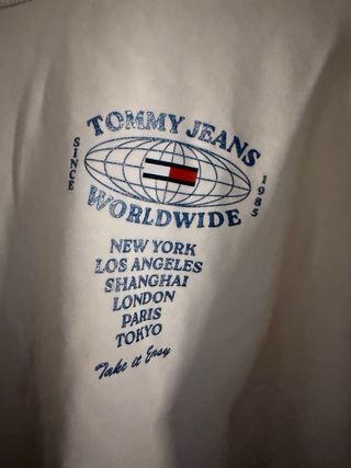 Jersey de Tommy Jeans en color blanco con diseño gráfico. S/M - Estampado Tommy Jeans Worldwide con globo terráqueo. - Detalle de logo en la manga. - Cuello redondo. -Parte trasera con estampado.