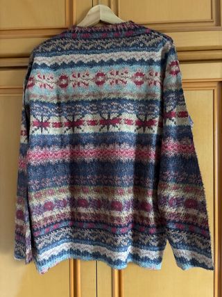 Jersey de punto con un diseño llamativo y cálido. - Tejido suave y confortable. - Estampado geométrico y floral.