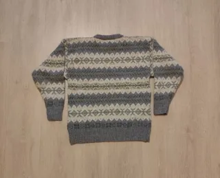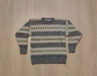Jersey de punto grueso con estampado geométrico estilo nórdico en tonos grises, blancos y verdes. Diseño clásico de invierno, muy cálido y cómodo, ideal para los meses fríos. Posee un cuello redondo y acabados en puños y cintura de canalé para un ajuste perfecto. Prenda perfecta para looks casuales, montaña o estilo vintage. Esta en muy buen estado y su tejido es suave con un diseño atemporal. TALLA: XS-S DE HOMBRE. #jersey #jerseylanoso #estilonordico #modainvierno #jerseypunto #vintageknit #winterstyle #jerseygris #casualwear #nudos #vintagedressing #jerseyvintage