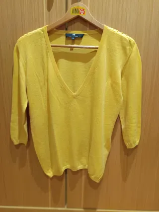 Jersey de punto. Cuello de pico pronunciado. Detalle de trenzado en hombros. Color amarillo mostaza. Mangas francesas. Un clásico. Como nuevo. Medidas: distancia entre hombros: 44, entre axilas:50, cintura: 45 cm. Largo de la prenda desde hombros 58 cm. Largo de la manga desde hombros: 42 cm y desde axila: 30 cm Talla 42 italiana, como una S española