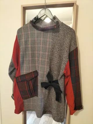 Jersey largo con un diseño patchwork muy original. Se me quemó con la plancha de nuevo y no ha ido a más y me le he puesto bastante es buena calidad . - Mangas de diferentes estampados. - Detalle de bolsillo en la parte delantera. - Lazada negra en el lateral.