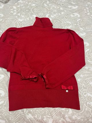 Jersey fino de cuello vuelto en color rojo. - Detalle de lazo de terciopelo en el bajo. - Puños con detalle de cinta de raso.