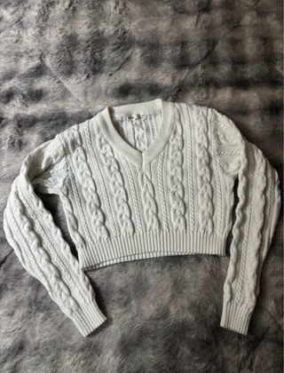 Jersey crop top de punto trenzado en color blanco. Un básico versátil para cualquier ocasión. - Diseño de punto trenzado. - Corte crop top. - Cuello en V.