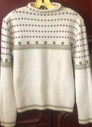 Jersey de punto y lana de la marca Lavand en talla M. - Presenta un diseño original jaspeado en cuerpo y mangas largas. - Cuello redondo amplio y mangas ceñidas. Largo a la cintura. - Usado dos veces. Perfecto estado.