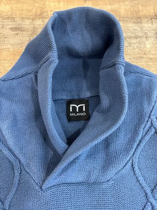 Jersey de punto azul para hombre con diseño de trenzas. - Cuello alto estilo shawl collar. - Tejido de punto grueso. - Puños y bajo acanalados. - Cedar Wood State. Talla M