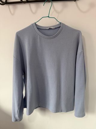 Jersey de manga larga en tono azul. Su tejido es ligero y cómodo. - Cuello redondo. - Corte holgado. - Bajo con aberturas laterales.