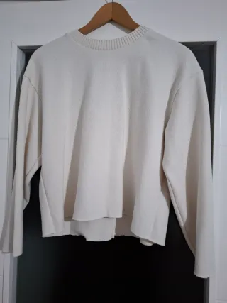 Jersey tipo crop top, de punto grueso Marca: Pimkie Talla: S. Es oversize. Color blanco, más bien marfil. Composición: 75% algodón, 25% poliéster. Estado: algo usado, en perfectas condiciones Precio: 7€.