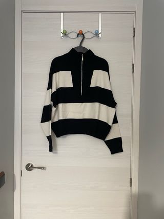 Jersey de punto con rayas . Cierre completo con cremallera. - Diseño de rayas horizontales. - Cuello alto. - Cremallera plateada.