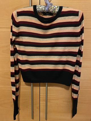 Jersey crop de Zara con estampado de rayas horizontales en varios colores. Es una prenda versátil y cómoda. - Diseño de rayas finas. - Manga larga. - Cuello redondo.