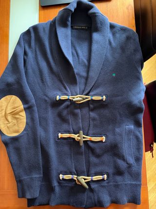 Jersey de punto con coderas y cierre de trenca. - Cierre de trenca con cordones y detalles de colores. - Coderas de ante. - Cuello tipo chal.