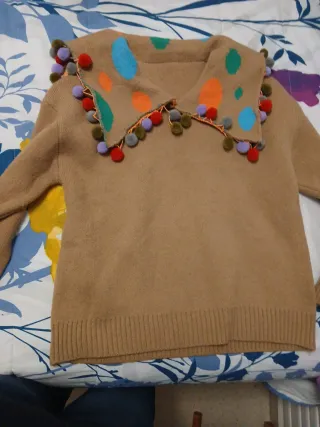 Jersey de Bershka con un diseño original y capucha. - Color rosa fucsia con cuerpo delantero, gorro y pulos de tejido de lana de varios colores, rosa fucsia, lila, azul y blanco. - Talla M. - Tejido 67%Acrilico, 28% Lana, 5% Elastano.