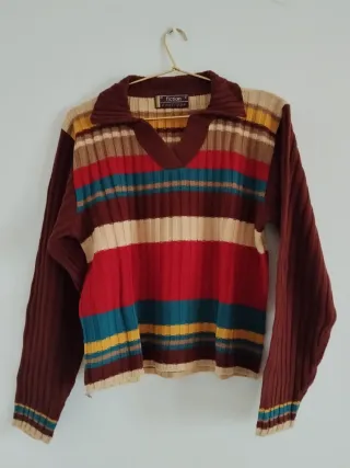 Jersey de punto con un original diseño de rayas multicolor y cuello camisero. Unisex. Vintage estilo retro.