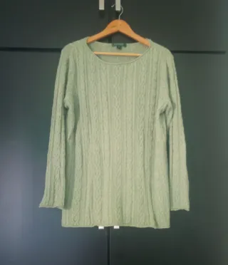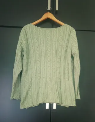 Jersey de punto trenzado en color verde. Confeccionado en algodón. Talla 1x. - Cuello redondo. - Manga larga. - Diseño de punto trenzado. - Medidas: Hombros: 42cm. Pecho: 61cm. Largo: 72 cm.