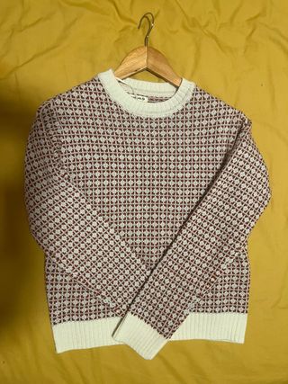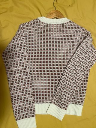 Jersey de punto con un diseño jacquard en tonos rojos y blancos. Es una prenda cómoda y versátil. - Cuello redondo. - Manga larga. - Puños y bajo de canalé.