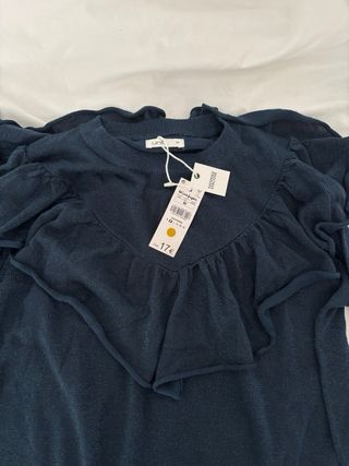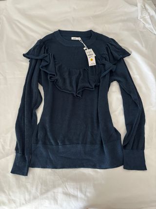 Jersey de punto fino con detalle de volantes en el delantero. Un toque elegante para cualquier ocasión. - Tejido con hilo de lurex. - Diseño con volantes. - Manga larga.