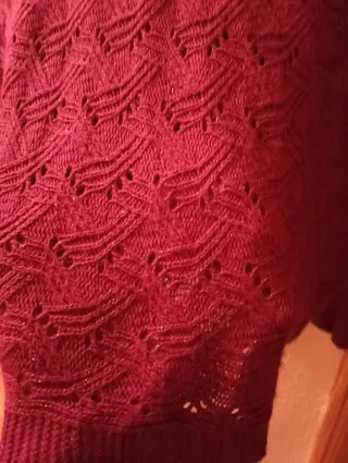 Jersey de punto con un diseño calado muy original. Tiene cuello camisero y un corte holgado. Talla S pero es ancho. - Tejido suave y ligero. - Detalle de etiqueta de cuero en la parte inferior.