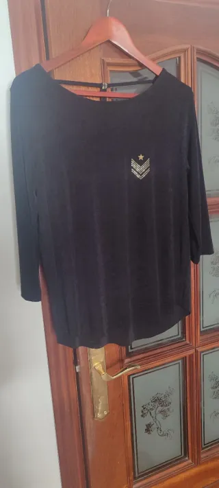 Jersey de manga tres cuartos con un diseño elegante y moderno. Perfecto para añadir un toque de estilo a tu atuendo. - Bastante amplio y de una caída muy flojita . - Adorno de estrellas y galones con pedrería. - Cuello redondo. - Corte holgado.