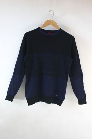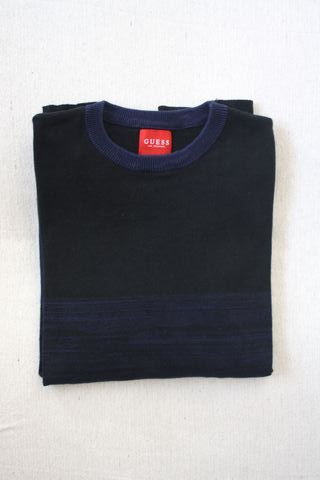 Jersey de Guess talla S. Fabricado en 100% algodón. Puede verse un poco desgastado en alguna parte como los puños (foto), pero la verdad es que se ve bastante bien ya que el tejido es de calidad. - Combinación de colores negro y azul. - Cuello redondo.