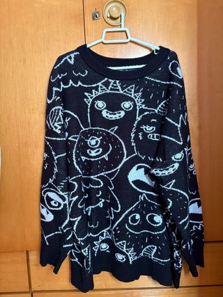 Jersey oversize con un divertido estampado de monstruos en blanco y negro. Su diseño llamativo lo hace perfecto para destacar. - Jersey de punto. - Estampado integral de criaturas. - Cuello redondo. Es muy grande. Medidas: - Pecho: 69cm - Largo: 73cm