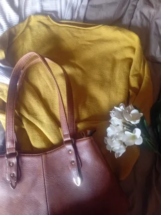 Conjunto de prendas de vestir para mujer y un bolso. - Cárdigan beige H&M cruzado de punto muy comodo. sin cremallera ni boton - Jersey mostaza de punto abrigado cuello redondo barco y manga acampanada - Bolso marrón tamaño mediano muy util con diversos bolsillos y cremalleras muy util. -muy buen estado
