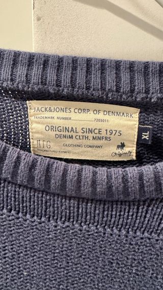Jersey de punto de la marca Jack & Jones en color azul. Presenta un diseño con pequeños detalles moteados en blanco y un bolsillo en el pecho. - Cuello redondo. - Detalle de botones en los hombros. - Parche con logo en el bajo.