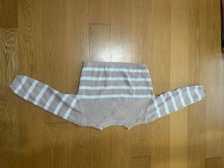 Jersey cropped de punto con un diseño de rayas horizontales. Es una prenda cómoda y versátil. - Diseño de rayas en beige y blanco. - Corte cropped moderno. - Tejido de punto suave.