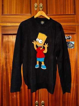 Jersey de punto negro con un diseño de Bart Simpson. - Personaje de Los Simpson. - Manga larga. - Cuello redondo. Tiene un pequeño apaño en una parte de Bart, como se aprecia en la última foto, porque se deshilacho. Por lo demás esta perfecto. Precio negociable.