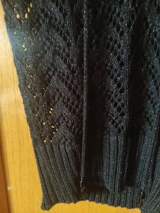 Jersey de punto calado es negro con un pequeño brillo y detalles de piedra negra en el borde de los cordones. Ideal para arreglarte estás fiestas!