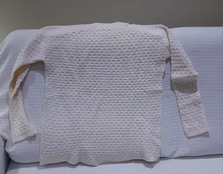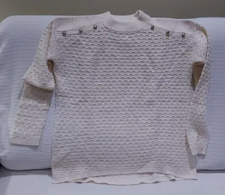 Talla M, pero talla grande, por lo que admite una L. Jersey de punto grueso con un diseño moteado. - Talla M-L. - Cuello redondo. - Mangas largas. .