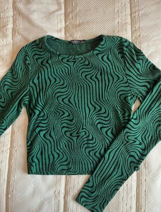 Jersey de manga larga con un llamativo estampado. - Diseño de ondas en verde y negro. - Cuello redondo. - Para ser una L, es pequeña yo diria mas que talla como M - Sin estrenar - mas info o fotos dm - precio negociable