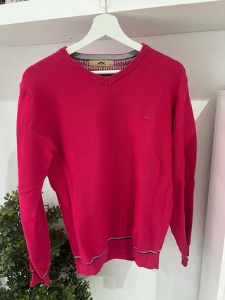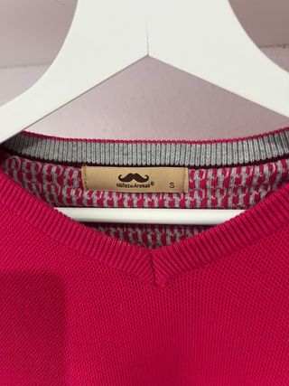 Jersey de punto marca Núñez de Arenas, color granate/fucsia, talla S. Diseño elegante con cuello en pico, tejido con textura tipo piqué y pequeños detalles en contraste en cuello, puños y bajo. Logo discreto bordado en el pecho. Ideal para uso diario o para vestir más arreglado. Uso previo, en buen estado. Se vende tal como se aprecia en las fotos. 👕 Talla: S 🎨 Color: granate / fucsia 🧶 Tejido: punto fino 👔 Estilo: casual / vestir