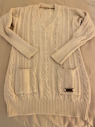 Suéter tradicional de punto trenzado, confeccionado en mezcla de lana y cachemira, con corte más largo y . Cuello, mangas y bajo de canalé. Dos bolsillos delante, uno de ellos con una chapa metálica con el logotipo de Burberry Brit. El suéter es largo y cubre las caderas; tambien se puede usar de vestido