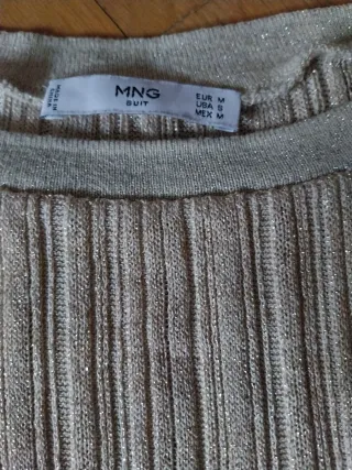 Jersey de canalé con hilo glitter dorado , de Mango. Un básico con un toque festivo. Diseño de canalé vertical. Tejido con hilo glitter dorado suave, ligeramente metalizado. Manga larga. Estructura recta