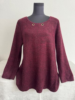 Jersey de manga larga con un diseño moderno y detalles únicos de color burdeos, talla única - Tejido jaspeado en tonos rojos y negros. - Cuello redondo con dos ojales metálicos. - Corte holgado y favorecedor. - Bajo curvo.