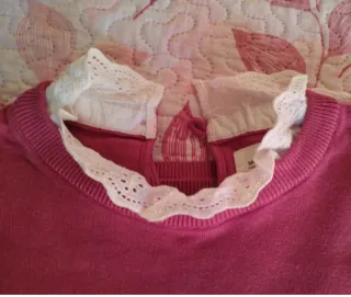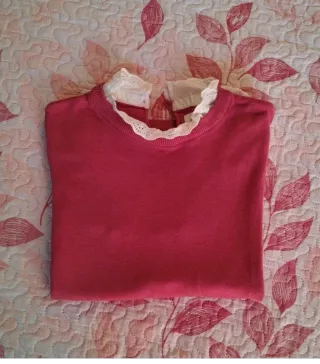 Jersey de punto fino en color rosa fuerte, con un detalle de cuello blanco con encaje. - Cuello blanco con puntilla. - Manga larga.