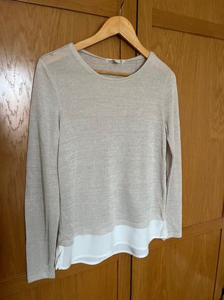 Jersey de manga larga en color beige. Presenta un detalle inferior combinando tela blanca semitransparente. - Cuello redondo. - Tejido ligero.
