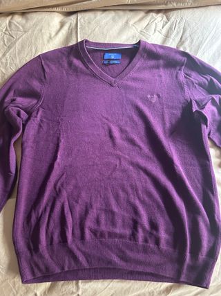 Jersey de la marca francesa Hartford en color azul marino. • Composición: 100% Lana (muy cálido y suave). • Detalles: Cuello en pico (V-neck) y coderas de ante a tono. • Talla: XL (Corte clásico/Regular). • Estado: Excelente estado, muy poco uso. Ideal para un look casual elegante o business casual. Muy similar a marcas como Gant o Massimo Dutti.