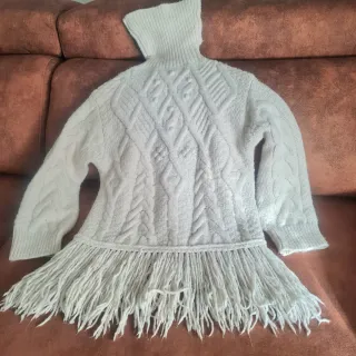 Jersey de punto con un diseño moderno y detalles únicos. -Talla S pero es amplio -Muy poco uso. -Muy calentito. - Cuello alto acanalado. - Trenzas y rombos en el tejido. - Base con flecos largos.