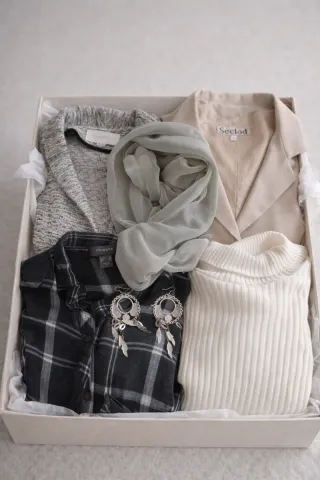 Conjunto de ropa para mujer talla XL que incluye varias prendas y accesorios. - Americana gris jaspeado. - Americana beige - Blusa de cuadros en blanco y gris - Jersey de cuello alto blanco acanalado. - Pañuelo plata. - Pendientes plateados con diseño de plumas. Todo las prendas son para una talla XL/42