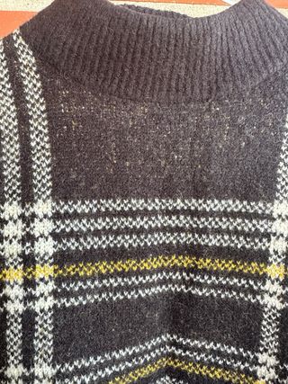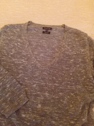 Jersey de cuello redondo con greca en el pecho. Aberturas laterales. Tejido suave con pelillo y destellos dorados. Poco uso.