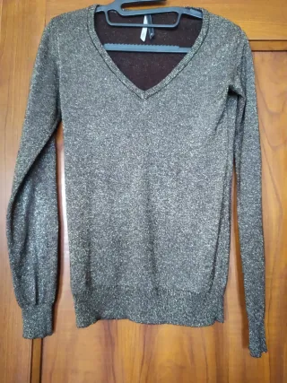 Jersey de Stradivarius con un toque brillante. - Diseño con cuello en pico. - Tejido con hilos metalizados dorados.