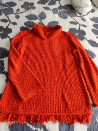 Jersey de punto con un diseño moderno y llamativo. - Cuello alto. - Detalle de flecos en el bajo. - Tejido de canalé. Pone talla 5 pero se corresponde con una M