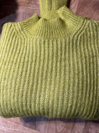 Jersey de punto fino en color verde claro. Es suave y ligero, ideal para entretiempo. - Diseño de cuello alto. - Tejido con acabado peludito.