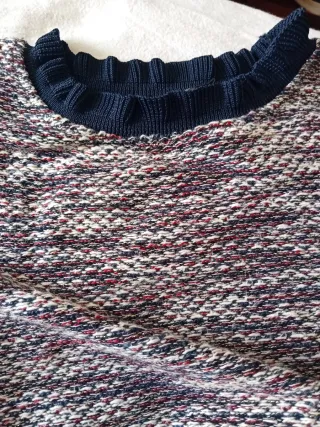 Tiene cuello de barco y queda suelto, lleva unos hilos dorados