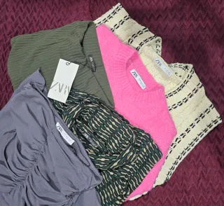 Conjunto de prendas de Zara. - Falda de color verde con textura. - Jersey de punto rosa. - Chaleco con estampado. - Vestido de punto crema con detalles Vestido con un pequeño desperfecto pero fácil de reparar