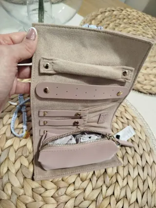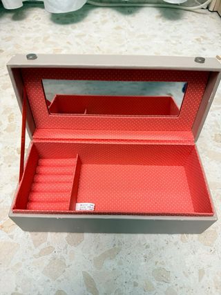 Elegante organizador de accesorios con un diseño práctico. - Compartimentos para anillos y bisutería. - Espejo integrado en la tapa.