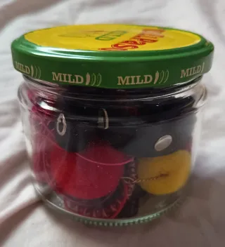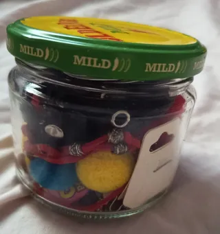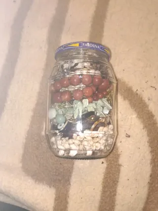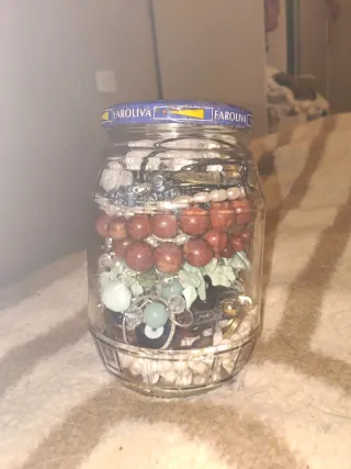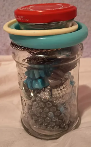 Tarro de cristal lleno de bisutería y abalorios. - Cierre metálico con etiqueta. - Variedad de pulseras y collares. - Cuentas de diferentes tamaños y materiales.