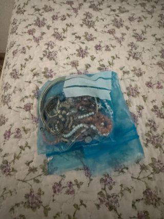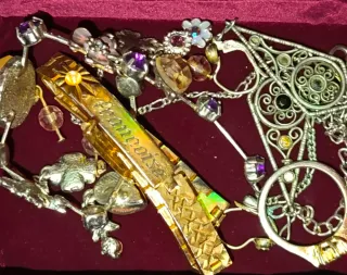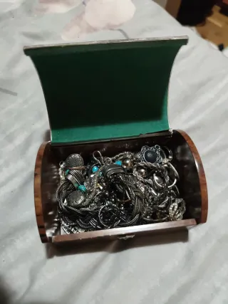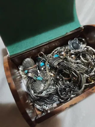 Pequeño cofre lleno de bisutería variada en tonos plateados. Incluye diferentes piezas como colgantes, pulseras, anillos y adornos con piedras decorativas. Se vende todo junto tal como aparece en las fotos, dentro del cofre. No he revisado todas las piezas en detalle, por lo que puede haber estilos muy variados. Ideal para quien disfrute descubriendo piezas curiosas, para coleccionistas, manualidades o proyectos de joyería. Perfecto como lote sorpresa o pequeño “tesoro” de bisutería. No se vende por separado.